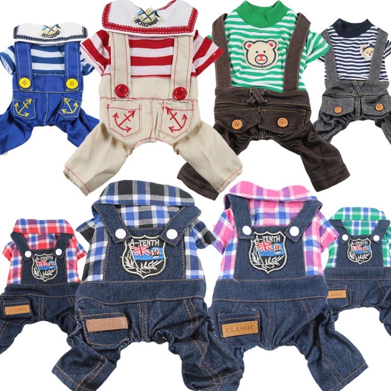 Giới thiệu Quần áo thú cưng - quần yếm jeans dạng liền phối áo sọc caro phong cách năng động xì tin cho chó mèo