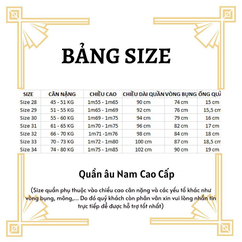 (Size quần âu nam phụ thuộc vào chiều cao cân nặng và các yếu tố khác như vòng bụng,đùi, hông, bắp chân, Do đó quý khách còn phân vân xin vui lòng nhắn tin trực tiếp để được hỗ trợ tốt nhất)
