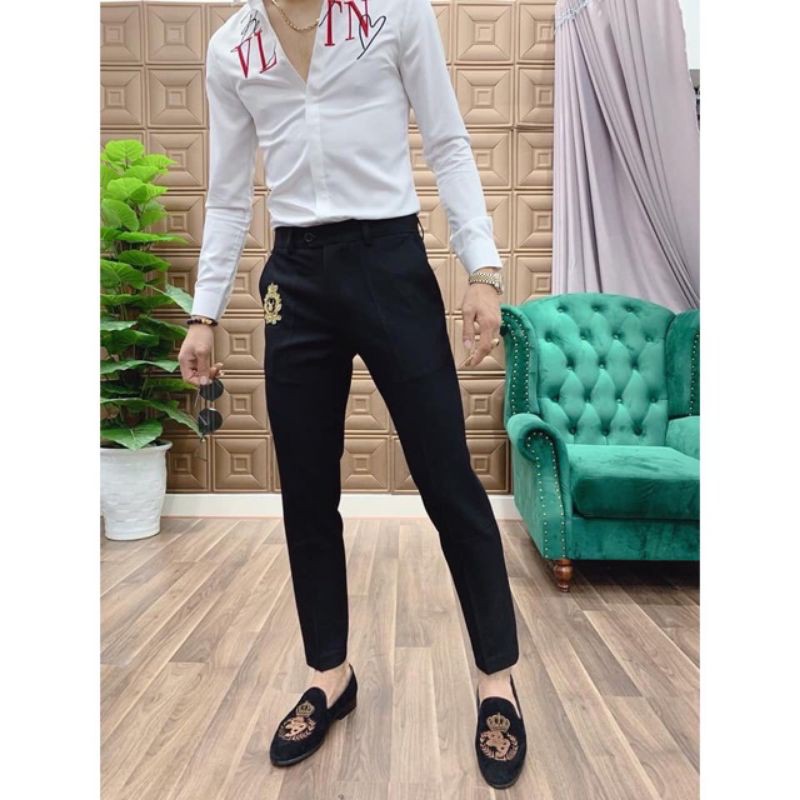Quần âu nam Đen thêu họa tiết ống côn , dáng ôm Body hàn Quốc, chất vải không nhăn, không bai xù