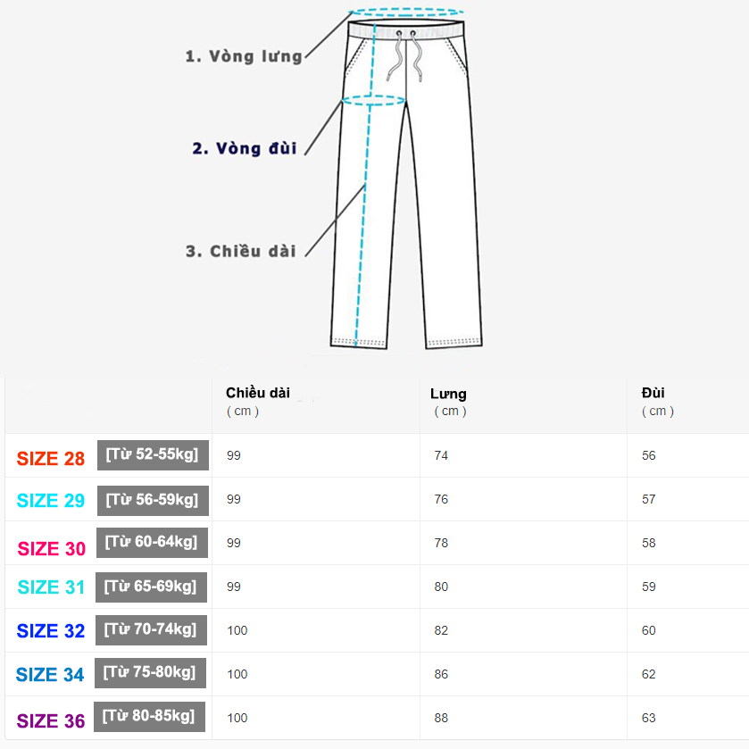 - Có các size 28, 29, 30,31, 32, 34, 36 (50 đến 85kg)