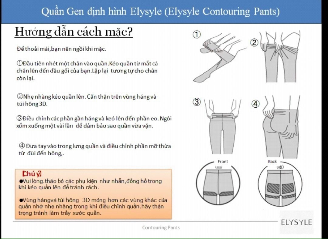 * Nên tháo cất các đồ trang sức/phụ kiện đeo tay như nhẫn hoặc đồng hồ khi mặc quần để tránh làm rách quần. Khuyến nghị nên mang găng tay vải khi mặc quần.