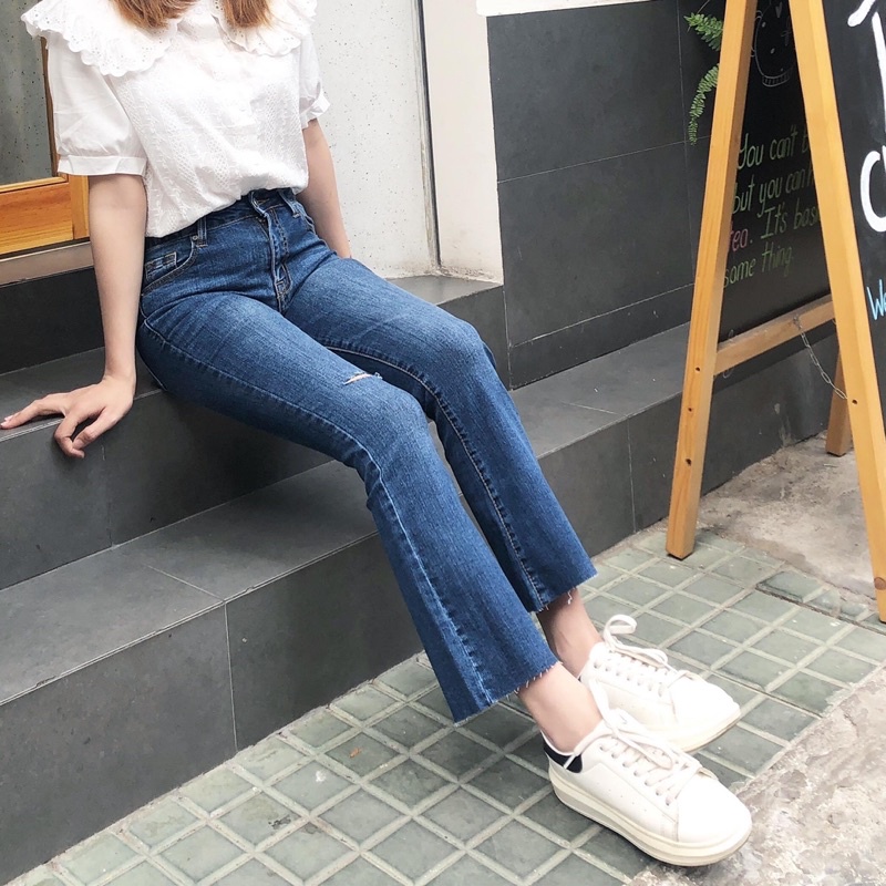 ➖Chất jeans dày dặn, có co giãn, form ống loe 9 tấc rất dễ mặc, đặc biệt phần lai kiểu phá cách trẻ trung và cá tính nhen