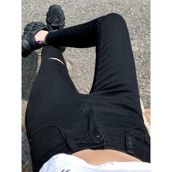 Quần Jean Skinny Ôm Đen Nữ Rách Gối TOPSHOP lưng cao co dãn