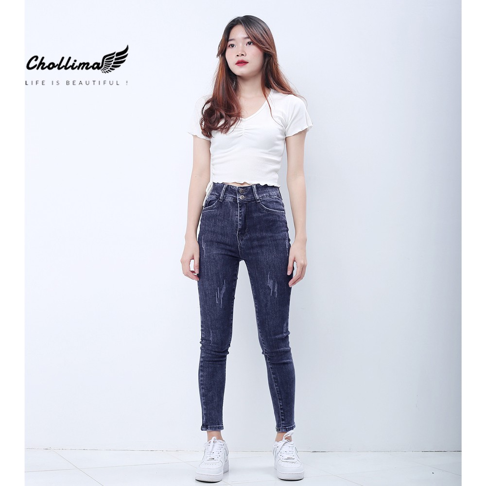 Quần jeans nữ co giãn Chollima cạp siêu cao mài xước màu xanh xám QD038 phong cách trẻ trung năng động