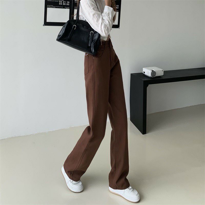 Quần jeans quần kaki ống suông nâu sữa cạp cao siêu hack chân siêu tôn dáng