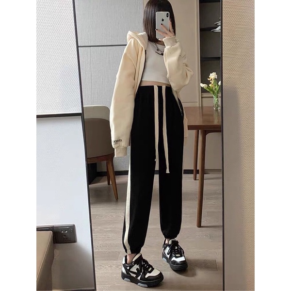 Giới thiệu Quần jogger nỉ tăm phối sọc dệt cao cấp ,Quần jogger nữ boom gấu nỉ tăm phối sọc