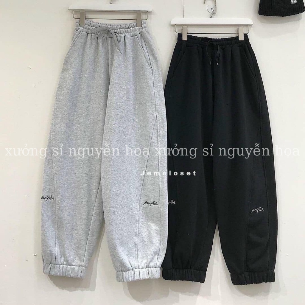 Giới thiệu Quần jogger nữ bom bo gấu dài chất nỉ dày dặn mặc mùa thu đông thêu chữ form rộng unisex kiểu màu xám đen