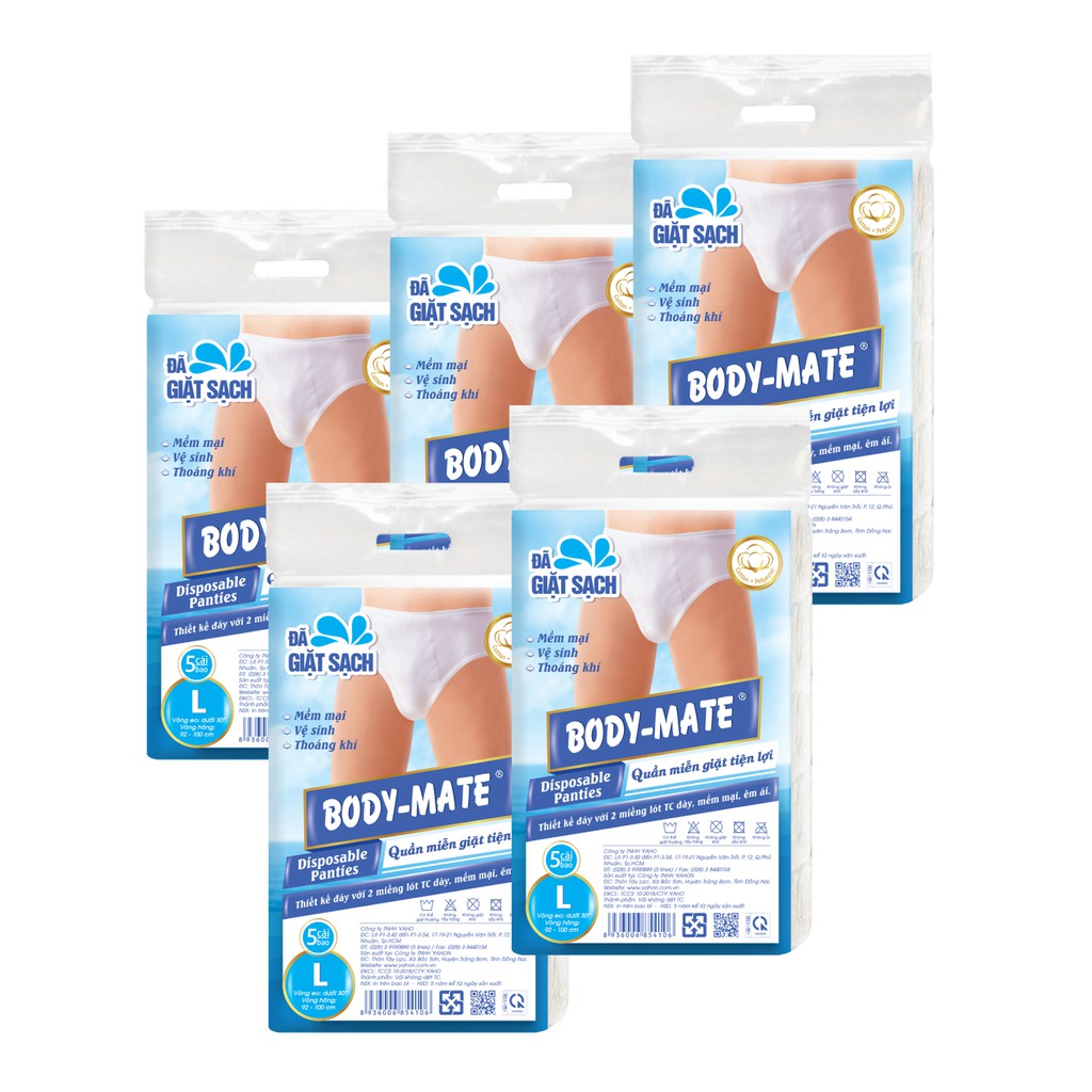 Thành phần: Vải không dệt PP. - Quy cách đóng gói: Mỗi gói gồm 5 quần, Hướng dẫn chọn size: Size L: Vòng mông: 92 – 102 cm; 5 cái/bao, Size XL: Vòng mông: 106 – 116 cm; 5 cái/bao,