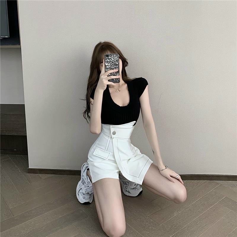 Giới thiệu quần short cạp cao phối cúc , quần giả váy cạp chéo viền chỉ nổi