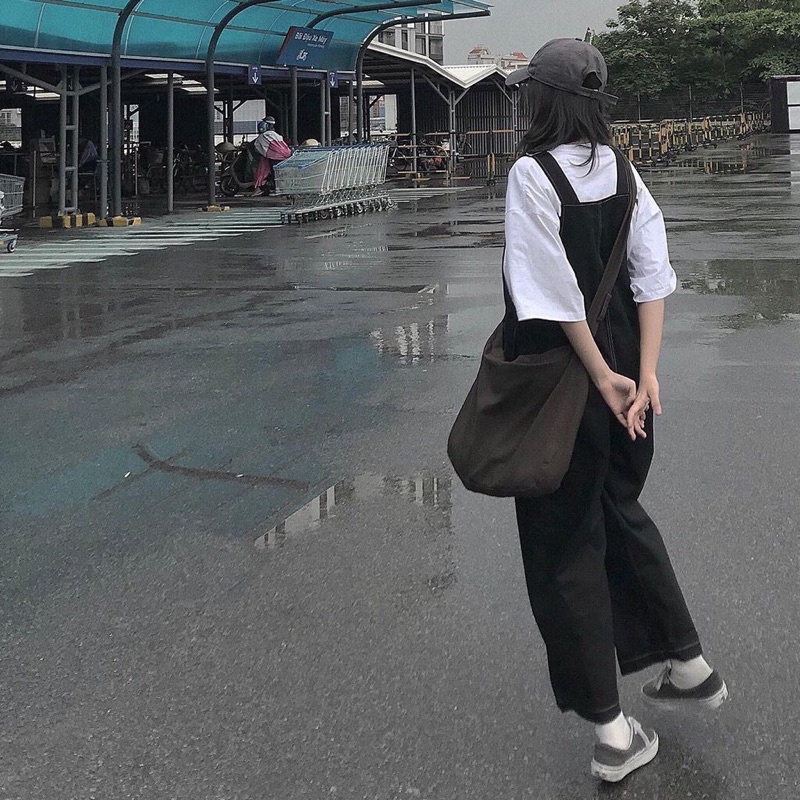 Thời Trang Nữ > Đồ liền thân > Quần yếm || Quần yếm kaki đen thêu logo bò sữa