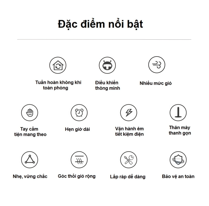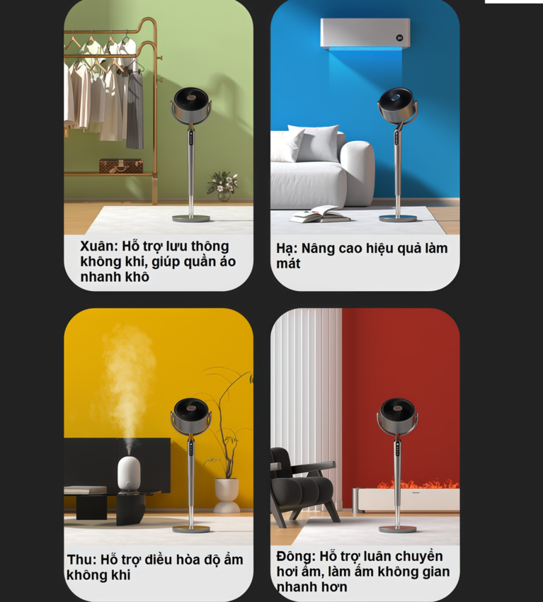 - Tác dụng sử dụng của quạt tuần hoàn không khí: Dùng chung với điều hòa, Dùng với máy sưởi, Làm thông thoáng phòng kín, Làm khô phòng, Phù hợp nhà có trẻ nhỏ/người già.