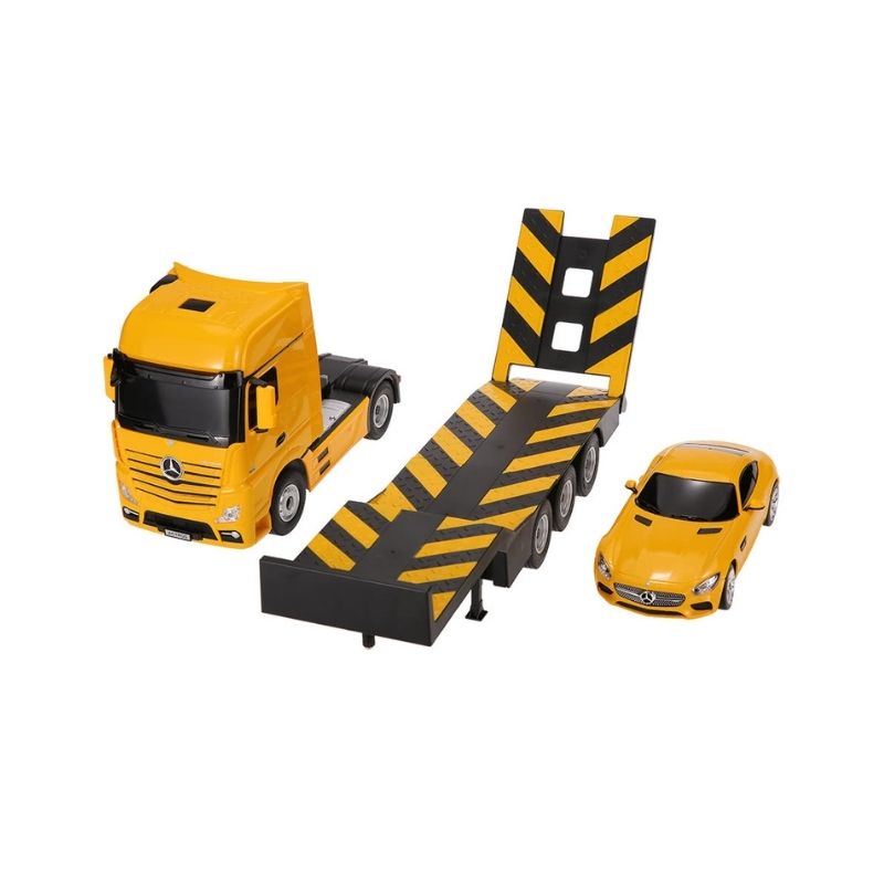 Sản phẩm gồm: đầu xe kéo, rơ móoc, siêu xe Mercedes Benz GT tỉ lệ 1:24, điều khiển 2 trong 1 Có thể sử dụng 1 điều khiển cho cả 2 xe cùng lúc hoặc điều khiển riêng từng xe