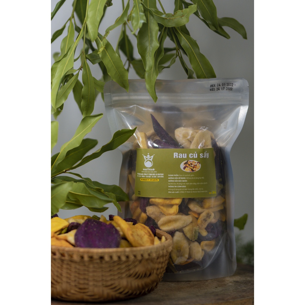 Tên sản phẩm: Rau củ quả đặc sản Đà Lạt sấy giòn Mai Thao - 250g Thành phần: 100% khoai lang, khoai môn, cà rốt, chuối, nho, mít. Khối lượng tịnh: 150g