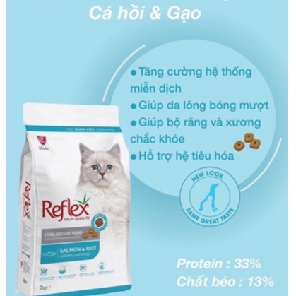 Ăn kèm men vi sinh Bioline MBR9 khi bé đổi sang thức ăn mới sẽ giúp chó mèo không bị rối loạn đường ruột, tiêu chảy khó tiêu nè 1. Cám mèo REFLEX KITTEN FOOD CHICKEN & RICE (Thịt gà và gạo) - Thức an cho mèo con * Phù hợp cho giai đoạn từ 2 ĐẾN 12 THÁNG TUỔI Đạm ≥ 32% Chất béo ≥ 18% 2. Cám mèo REFLEX ADULT CAT FOOD CHICKEN & RICE (Thịt gà và gạo) - Phù hợp cho giai đoạn TRÊN 12 THÁNG TUỔI Đạm ≥ 31% Chất béo ≥ 12% 3. Cám mèo REFLEX STERILISED CAT FOOD SALMON & RICE (Cá hồi) * Phù hợp cho giai đoạn TRÊN 12 THÁNG TUỔI * Dành cho tất cả các giống mèo (đặc biệt giúp tiệt trùng đường ruột của mèo) Đạm ≥ 31% Chất béo ≥ 12% 4. Thức ăn cho mèo REFLEX PLUS KITTEN FOOD CHICKEN (Thịt gà) * Phù hợp cho giai đoạn từ 2 ĐẾN 12 THÁNG TUỔI Đạm ≥ 34% Chất béo ≥ 17% 3. Thức ăn cho mèo REFLEX PLUS ADULT CAT FOOD URINARY CHICKEN (Thịt gà) * Phù hợp cho giai đoạn TRÊN 12 THÁNG TUỔI * Dành cho tất cả các giống mèo (đặc biệt ngăn ngừa bệnh tiết niệu ở mèo) thể trọng từ 2 - 10Kg Chất béo ≥ 12% 4. Thức ăn cho mèo REFLEX PLUS ADULT CAT FOOD SALMON (Cá hồi) * Phù hợp cho giai đoạn TRÊN 12 THÁNG TUỔI * Dành cho tất cả các giống mèo thể trọng từ 2 - 10Kg Đạm ≥ 30% Chất béo ≥ 13% 5. Thức ăn cho mèo REFLEX PLUS ADULT CAT FOOD CHICKEN (Thịt gà) * Phù hợp cho giai đoạn TRÊN 12 THÁNG TUỔI * Dành cho tất cả các giống mèo thể trọng từ 2 - 10Kg Đạm ≥ 32% Chất béo ≥ 12% 6. Reflex Plus Adult Cat Food Choosy Salmon (1,5kg) * Phù hợp cho mèo trưởng thành trên 12 tháng tuổi, dành cho mèo kén ăn Thành phần: Protein cá hồi (khử nước tối thiểu 27%), protein gà (khử nước), gạo, bắp, mỡ gà bã củ dền, hương cá, hương gan, dầu cá hồi, vitamin và khoáng chất, xylo-oligosaccharides, men bia, muối, chiết xuất cây yucca schidigera, chất bảo quản chống oxy hóa. – Chỉ tiêu dinh dưỡng: Protein: 33% Chất béo: 12% Tro: 12% Xơ: 5% REFLEX LÀ THƯƠNG HIỆU THỨC AN CHO MÈO CAO CẤP ĐẾN TỪ THỔ NHĨ KỲ. Sản phẩm Châu Âu nhưng giá bình dân như Châu Á, đặc biệt thành phần chất đạm và chất béo khá cao, không thua kém về mặt dinh dưỡng so với các thương hiệu khác. – Thức ăn khô cho mèo siêu cao cấp với công thức cân bằng và hoàn chỉnh dành cho giống mèo từ sơ sinh đến trưởng thành. – Dành cho tất cả giống mèo trên 12 tháng tuổi. Thể trọng từ 2kg – 10kg.