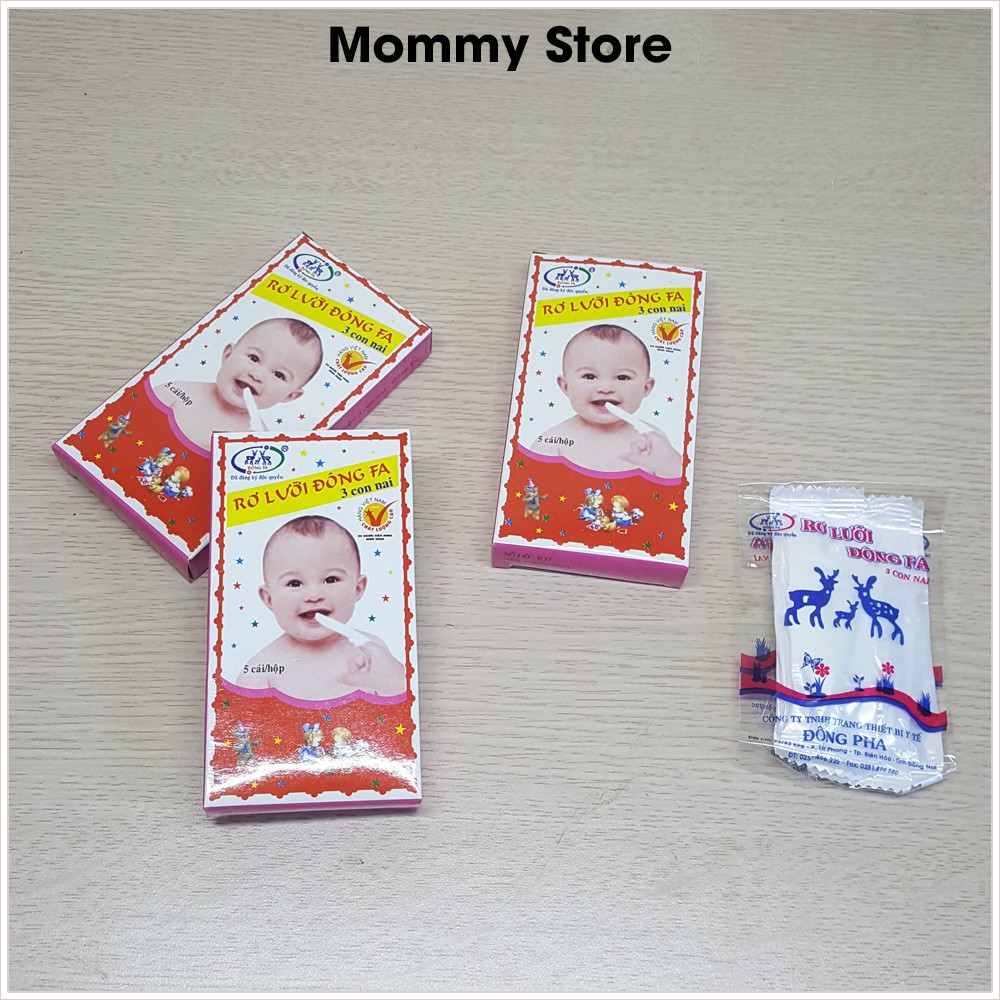 Thông tin sản phẩm rơ lưỡi Đông Fa cho bé - Chất liệu: Sợi polyester mềm không chứa BPA an toàn cho bé - Quy cách: 5 cái/hộp - Hãng sản xuất: Đông Pha - Nhập khẩu và phân phối bởi: Mommy Store - Địa chỉ: Hồi Quan- Tương Giang- Từ sơn- Bắc Ninh - Xuất xứ: Việt Nam - Sản phẩm dùng vệ sinh lưỡi và miệng cho bé