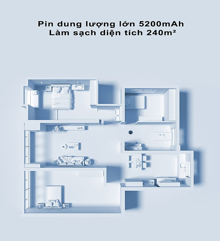 Viên pin dung lượng lớn 5200mAh được sạc tự động qua trạm sạc, mỗi lần sạc đầy có thể làm sạch khu vực 240m² ở chế độ tiêu chuẩn của robot.