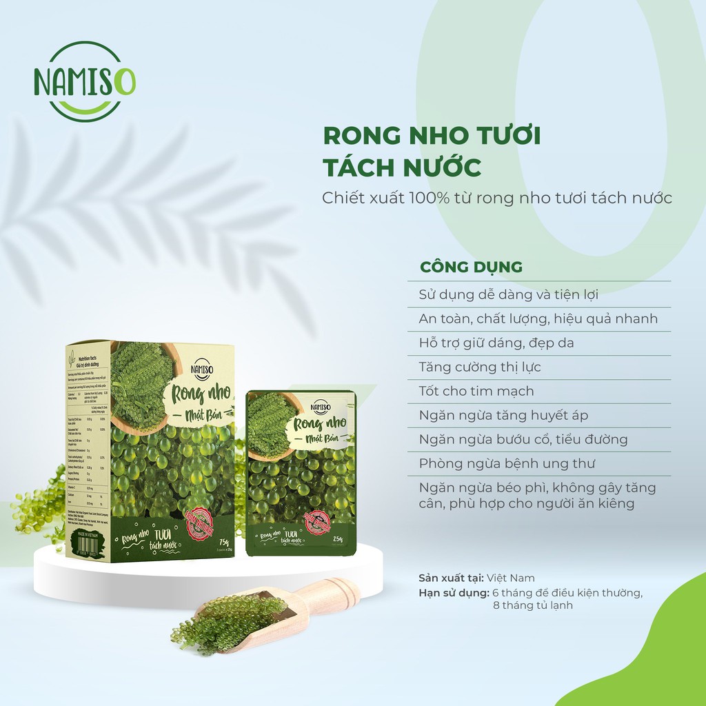 Rong Nho Tách Nước Khánh Hoà thuộc cty sea việt - Giàu Dinh Dưỡng - Công Nghệ Tách Nước Tiêu Chuẩn Nhật Bản. sản phẩm dc tách lẻ từ hộp 220g 🍀 Hướng dẫn sử dụng rong tươi tách nước (rong muối ): Hạn sử dụng: 6 tháng Trọng lượng: 20g nở ra khoảng 60g 👉 Bước 1: Bỏ Rong nho muối vào nước ngọt ngâm từ 3 - 5 phút, rong nho sẽ từ từ nhả đi bớt vị mặn của muối, và trở về hình dáng như rong tươi 👉 Bước 2: Sau đó cho vào tô nước đá đập nhỏ ngâm cho rong giòn và lạnh khoảng 2 phút ,để tẩy bớt mùi tanh của biển. Chúng ta nên lấy một lượng rong đủ ăn cho 1 lần, ăn bao nhiêu bỏ rong bấy nhiêu, vì rong sẽ bị teo lại sau 30 phút. 👉 Bước 3: Dùng trực tiếp như một dạng rau xanh với các loại nuớc chấm thông thường như: Xì dầu + wasabi (mù tạc) + chanh + đường hoặc sốt mayonnaise + tương ớt. 😋 Nếu ăn chay thì chấm với xì dầu ớt… 😋 Tuỳ khẩu vị hoặc ăn kèm với các món ăn khác như: Tôm Nướng mắm nhỉ, Mực lá nướng muối ớt, Tôm hùm hấp bia, Tôm đất sống...😋