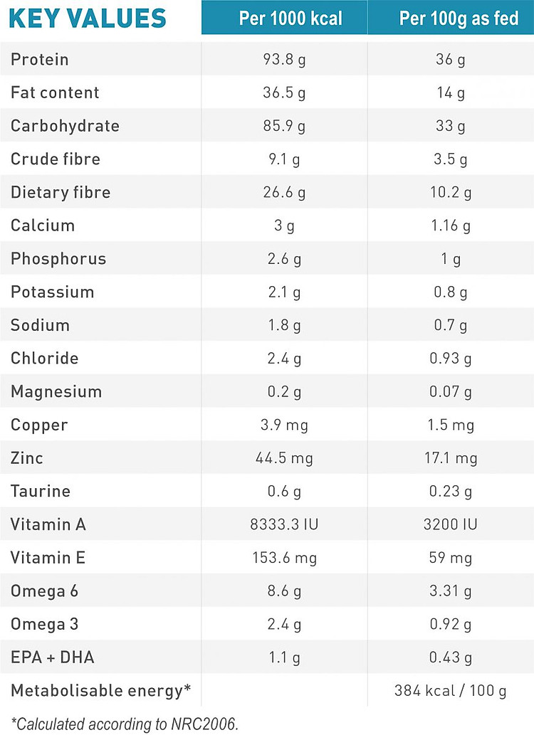 Bắp, bột protein gia cầm, gluten lúa mì*, gạo, gluten bắp, protein động vật thủy phân, chất béo động vật, chất xơ thực vật, củ cải đường, khoáng chất, dầu cá, vỏ và hạt psyllium, fructo-oligo-saccarit, dầu đậu nành, dầu lưu ly, chiết xuất cúc vạn thọ (nguồn lutein).