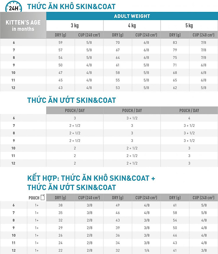 Ngay sau khi xuất hiện những triệu chứng đầu tiên của bệnh ngoài da, nên cho mèo sử dụng chế độ ăn trong thời gian 2 tháng để có kết quả rõ rệt. Đối với những chú mèo bị mãn tính, có thể duy trì sử dụng chế độ ăn hỗ trợ da liễu đến năm 7 tuổi.