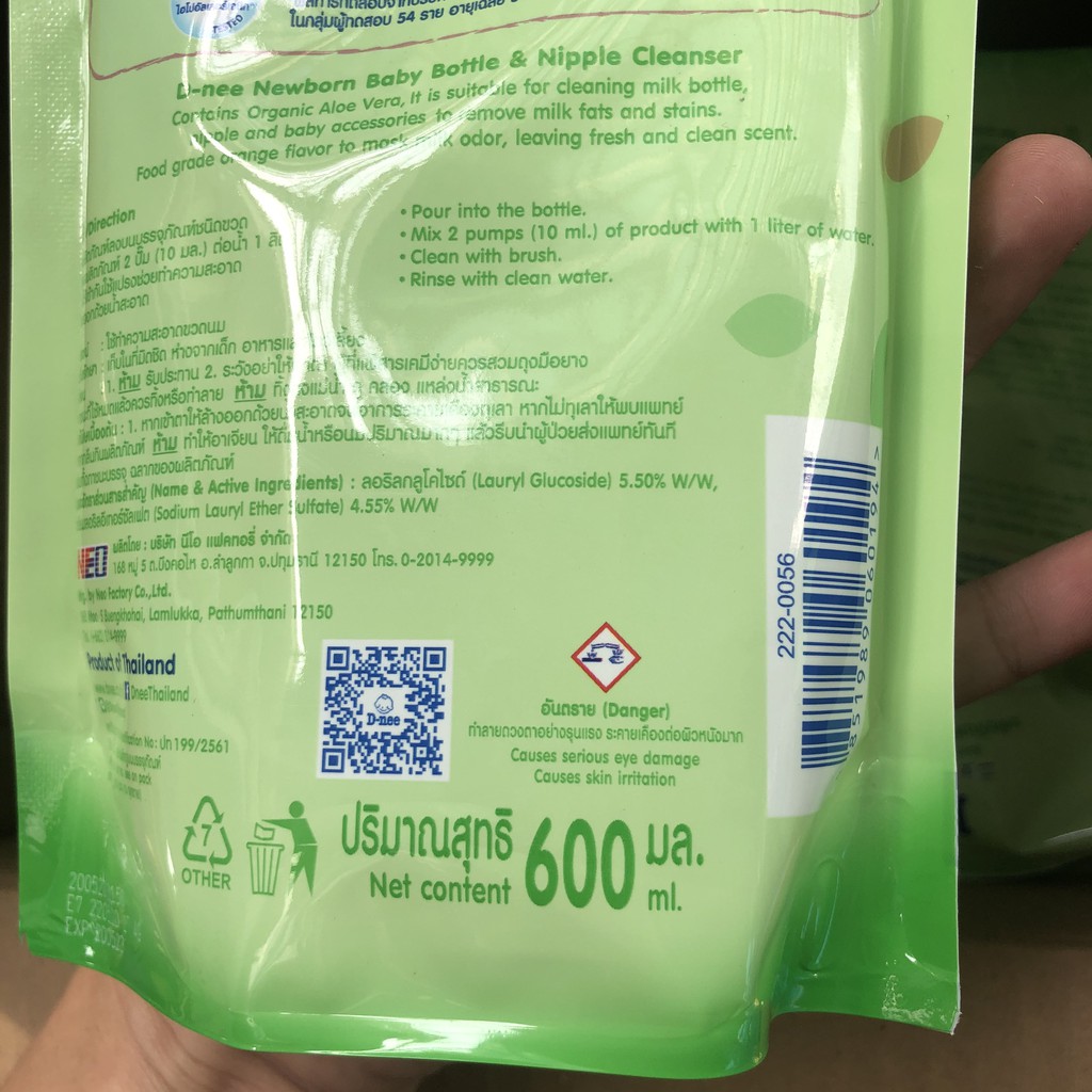Nước rửa bình sữa Dnee Organic 600ml 💕 Thông tin thương hiệu DNEE: Dnee là một thương hiệu về sản phẩm chăm sóc gia đình và trẻ em nổi tiếng của Thái Lan. Các dòng nước giặt xả, sữa tắm, dầu gội dành cho trẻ sơ sinh và gia đình,.... được hàng triệu người Việt Nam tin dùng. Tất cả sản phẩm của Dnee đều được trải qua những quy trình sản xuất nghiêm ngặt để đạt được tiêu chuẩn chất lượng cao nhất. 💕 THÔNG TIN CHI TIẾT: * Xuất xứ: Thái Lan * Dung tích: 600ml * Nước rửa bình sữa Dnee TÚI 600ml sản xuất tại Thái Lan bởi D-nee, nhãn hiệu chất lượng hàng đầu Thái Lan về bình sữa, núm vú, máy hút sữa và các sản phẩm chăm sóc làn da và đồ vệ sinh cho trẻ em. * Là dung dịch tẩy rửa nhẹ nhàng, lấy đi các chất cặn, vết mỡ, protein, hạn chế nấm mốc cho bình sữa, núm vú, dụng cụ cai sữa, rau quả và đồ chơi trẻ em. * Sản phẩm có thành phần từ các chất tương tự như bánh gatô và kem trái cây, nên rất an tâm khi sử dụng cho bé. * Là hoá hợp của các chất có khả năng tẩy rửa như este, glycoliqid hàm chứa bên trong trái cây, và tinh chất từ cam.