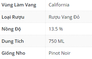 Loại rượu Pinot Noir này mang đến hương thơm gợi cảm của anh đào đỏ, vani, đất và gia vị, theo sau là hương anh đào đen và mận, thoảng chút hương hạt phỉ nướng trong vòm miệng.