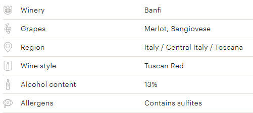 Thành phần | Rượu được kết hợp từ hai giống nho: Merlot và Sangiovese. |