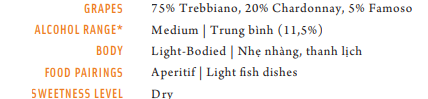 Giống nho | 75% Trebbiano, 20% Chardonnay, 5% Famoso |