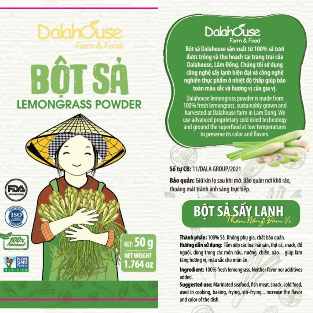Bột Sả Dalahouse nguyên chất 100% Sả tươi được trồng và thu hoạch tại nông trại hữu cơ Dalahouse. Chúng tôi sử dụng công nghệ Sấy Lạnh hiện đại và công nghệ nghiền thực phẩm ở nhiệt độ thấp giúp bảo toàn hương vị và dưỡng chất tự nhiên trong sả. Bột Sả ấm có vị cay và mùi thơm.
