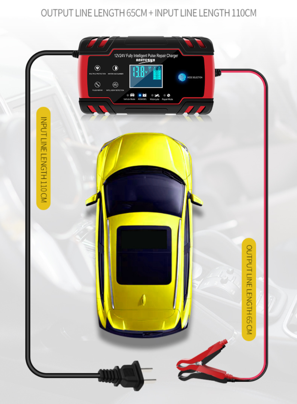 - Chiều dài đây nguồn 110 cm, chiều dài dây kẹp 65 cm.