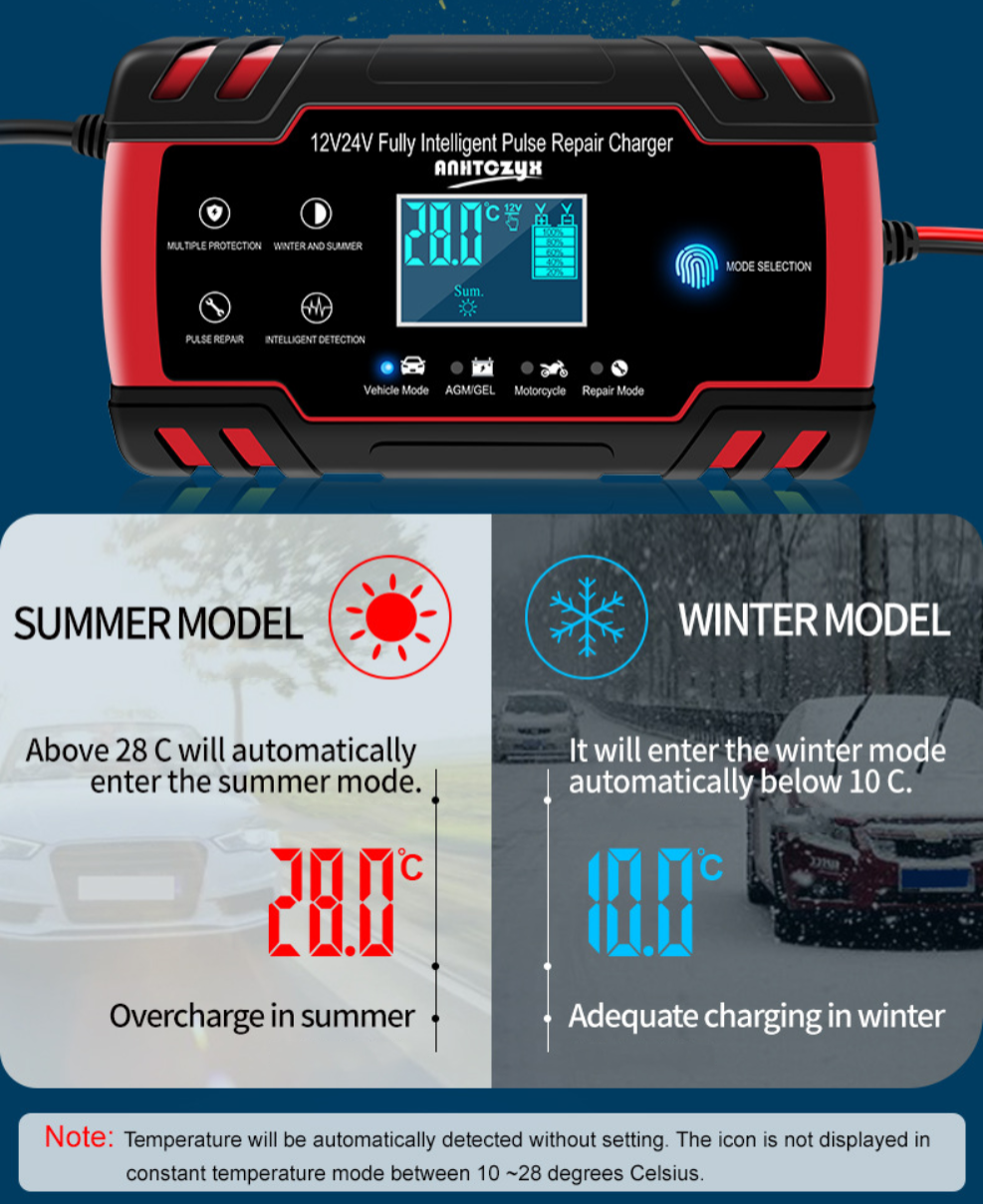 - Có khả năng tự động cảm nhận nhiệt độ môi trường, để từ đó điều chỉnh điện áp sạc sao cho phù hợp (Trên 28 độ sẽ vào chế độ mùa hè, dưới 10 độ sẽ vào chế độ mùa đông).