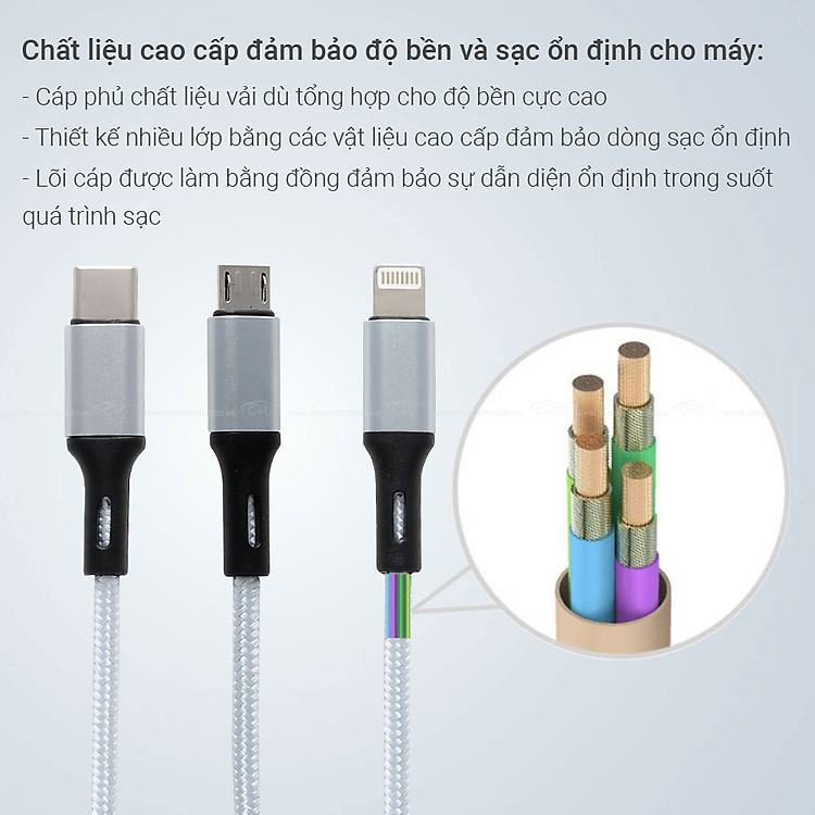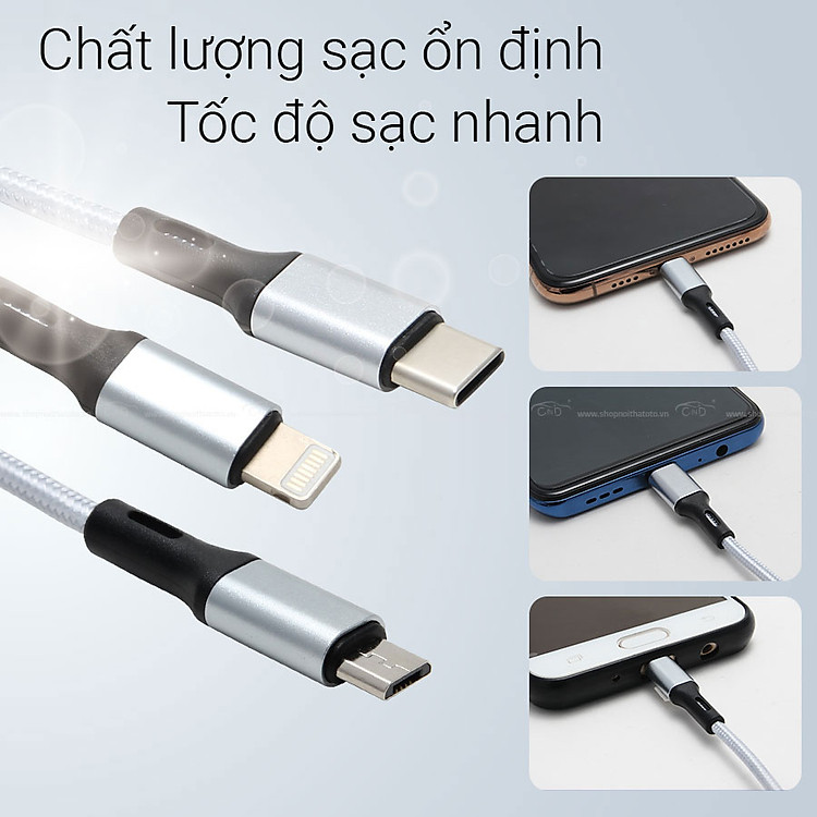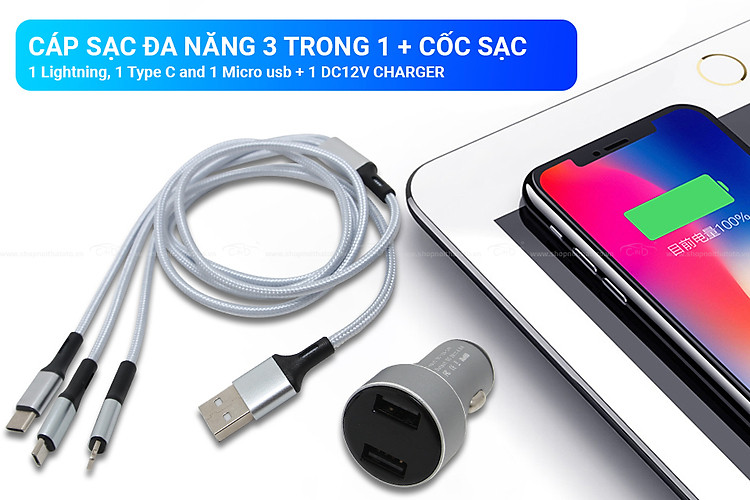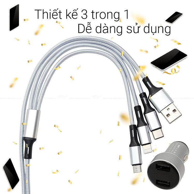 - Bộ sạc điện thoại 2 cổng USB và cáp sạc 3 đầu Lightning/Micro USB/Type C C74 màu bạc với thiết kế sang trọng đa năng, có thể sử dụng cho nhiều loại điện thoại trên thị trường. Chất lượng sạc ổn định, tốc độ sạc nhanh giúp bạn an tâm trong quá trình sử dụng. Kiểu dáng nhỏ gọn, dễ dàng tương thích với nhiều loại cốc sạc hay đầu ghim USB, sạc dự phòng.