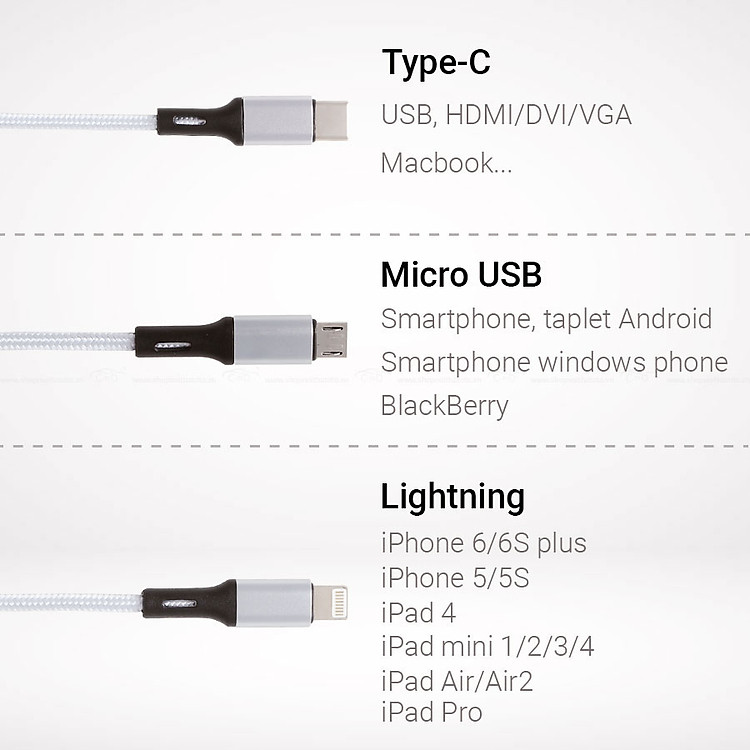 Công dụng của Bộ sạc điện thoại 2 cổng USB và cáp sạc 3 đầu Lightning/Micro USB/Type C C74 màu bạc