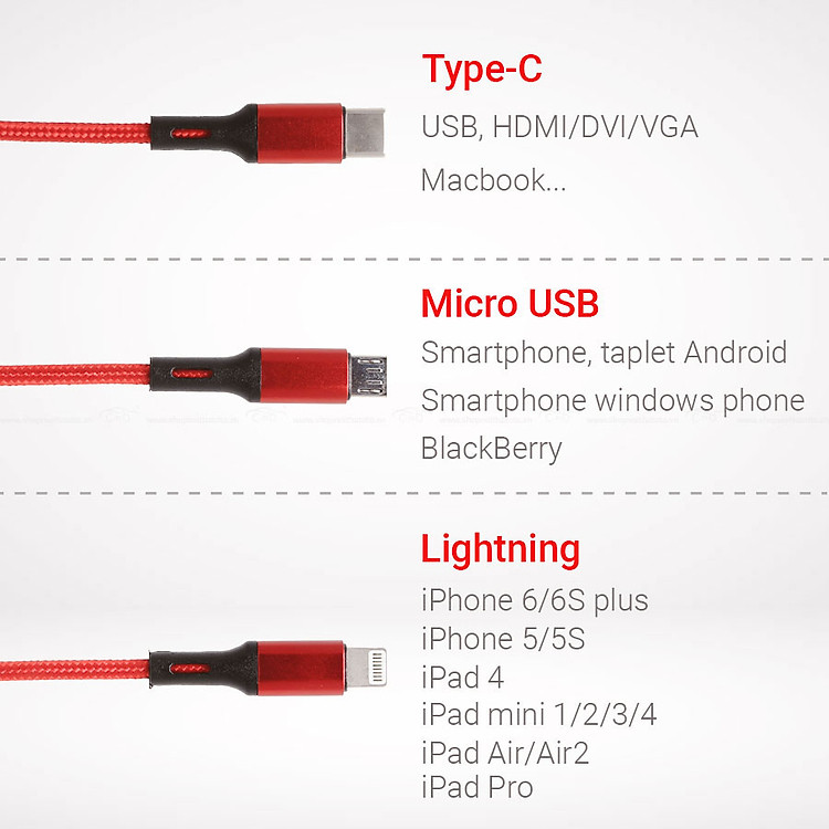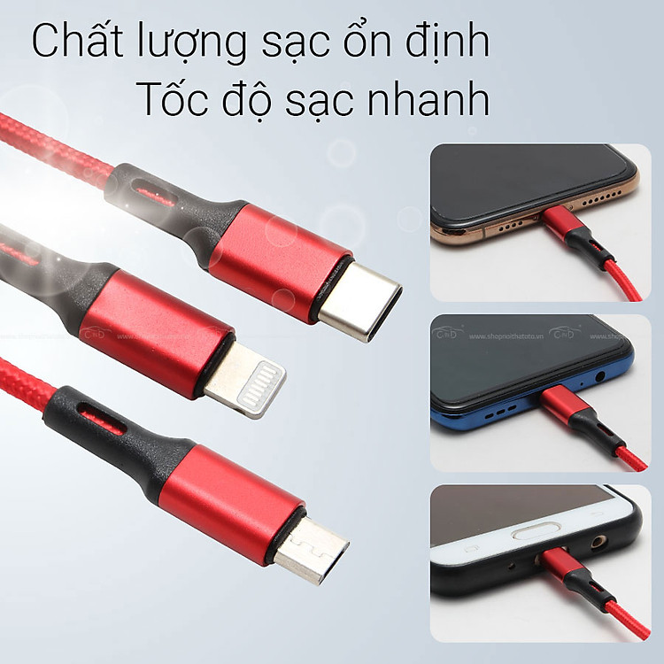 Công dụng của Bộ sạc điện thoại 2 cổng USB và cáp sạc 3 đầu Lightning/Micro USB/Type C C74 màu đỏ