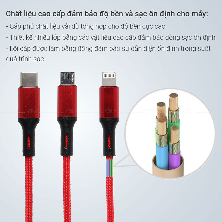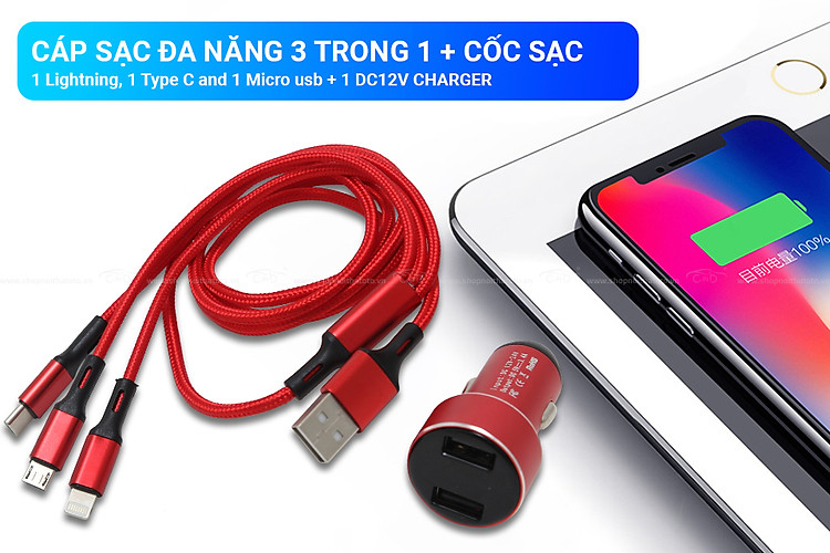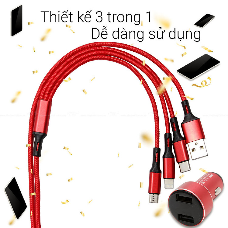 - Bộ sạc điện thoại 2 cổng USB và cáp sạc 3 đầu Lightning/Micro USB/Type C C74 màu đỏ với thiết kế sang trọng đa năng, có thể sử dụng cho nhiều loại điện thoại trên thị trường. Chất lượng sạc ổn định, tốc độ sạc nhanh giúp bạn an tâm trong quá trình sử dụng. Kiểu dáng nhỏ gọn, dễ dàng tương thích với nhiều loại cốc sạc hay đầu ghim USB, sạc dự phòng.