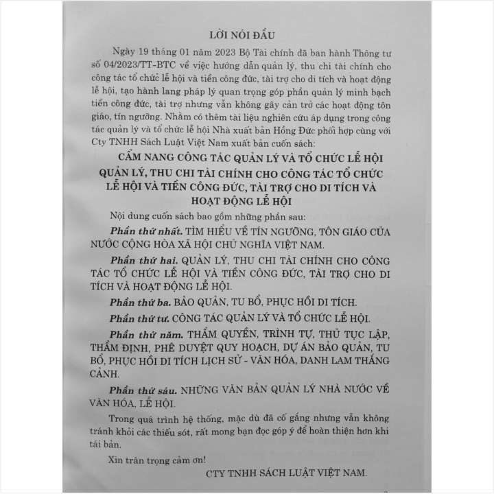 Nhà sách Nam Việt – Namvietbook xin trân trọng giới thiệu sách Cẩm Nang Công Tác Quản Lý và Tổ Chức Lễ Hội - Quản Lý Thu Chi Tài Chính Cho Công Tác Tổ Chức Lễ Hội và Tiền Công Đức, Tài Trợ Cho Di Tích và Hoạt Động Lễ Hội