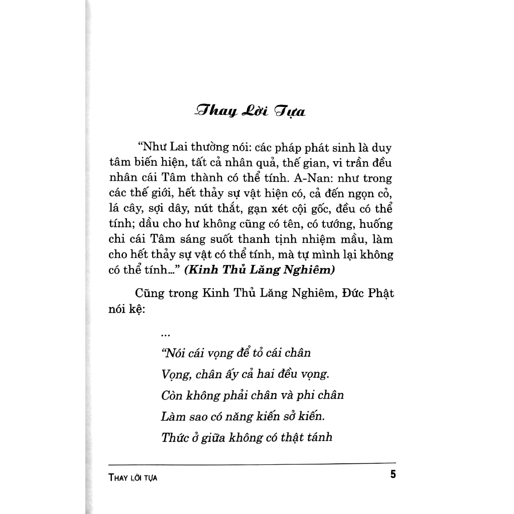 Như Lai thường nói : các pháp phát sinh là duy tâm biến hiện, tất cả nhân quả, thế gian, vi trần đều nhân cái Tâm thành có thể tính. A-Nan : như trong các thế giới, hết thảy sự vật hiện có , cả đến ngọc cỏ, lá cây, sợi dây, nút thắt, gạn xét cội gốc, đều có thể tính : dầu cho hư không cũng có tên, có tướng, huống chi cái Tâm sangsuoost thanh tịnh nhiệm mầu, làm cho hết thảy sự vật có thể tính, mà tự mình lại khoongcos thể tính ..." (Kinh Thủ Lăng Nghiêm) Cũng trong Kinh Thủ Lăng Nghiêm, Đức Phật nói kệ : ... Nói cái vọng để tỏ cái nhân Vọng, chân ấy cả hai đều vọng. Còn không phải chân và phi chân Làm sao có năng kiến sở kiến. Thức ở giữa không có thật tánh Vậy nên như mình lau gác nhau Cột và cởi đồng một sở nhân. Thánh và phàm không có hai đường". .......... Mời các bạn đọc !