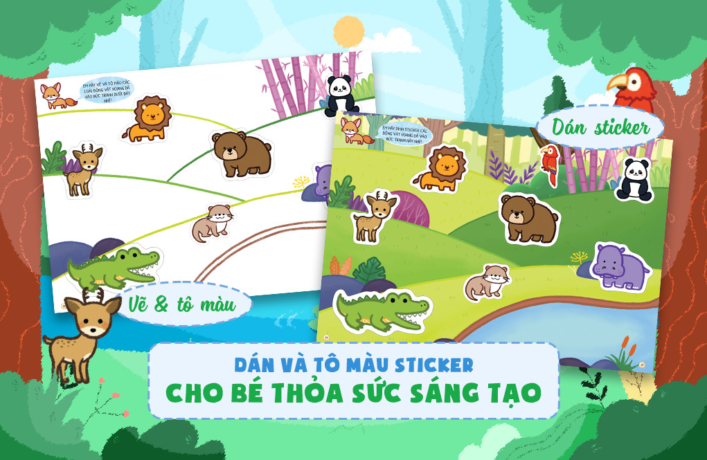 - Dán sticker và tô màu: Không chỉ có vẽ, em còn có cơ hội phát triển khả năng sáng tạo thông qua dán và tô màu. Giúp em thực hiện những tác phẩm độc đáo và phong phú theo trí tưởng tượng của mình.