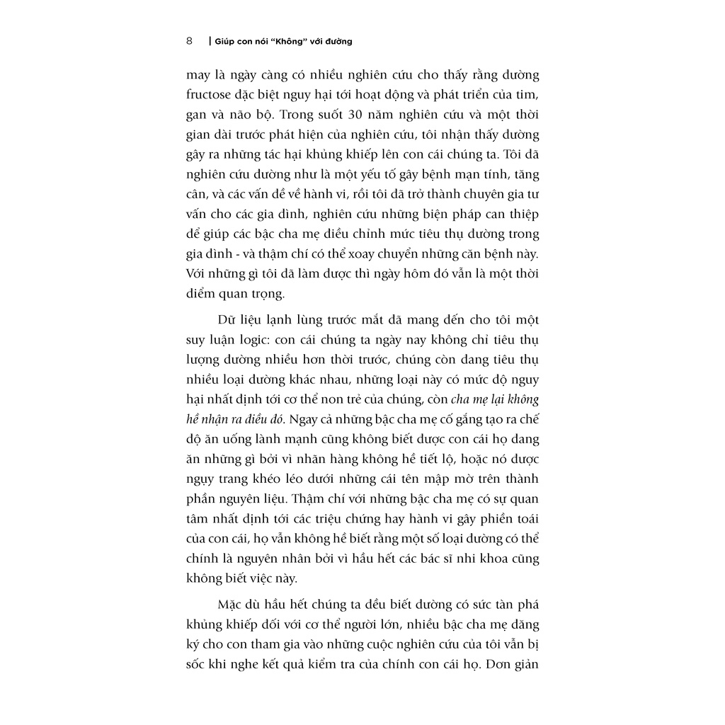 GIÚP CON NÓI “KHÔNG” VỚI ĐƯỜNG Những mối nguy hiểm tiềm ẩn của Đường gây nguy hại đến sức khỏe của con bạn và Những điều bạn có thể làm Tác giả: Tiến sĩ Michael I Goran và Tiến sĩ Emily E. Ventura Phần lớn chúng ta đều biết rằng đường có hại cho cơ thể người nhưng rất ít người nhận ra tác hại kinh khủng mà đường gây ra cho những đứa trẻ của chúng ta, về mặt thể chất, cảm xúc và sức khỏe tâm thần. Tiến sĩ, nhà nghiên cứu hàng đầu về tình trạng béo phì của trẻ em, Michael Goran (Trường Đại học Nam California) đã chỉ ra rằng ngày nay trẻ em không chỉ tiêu dùng nhiều lượng đường hơn mà còn nhiều dạng đường hơn trước. Điều này đặc biệt có hại cho sự phát triển của gan, tim và não bộ. Quan trọng hơn là không có nhiều bậc phụ huynh nhận ra ảnh hưởng xấu này lên những cơ thể non nớt của con cái họ. Trong cuốn sách Giúp con nói “Không” với đường, các tác giả Gor...