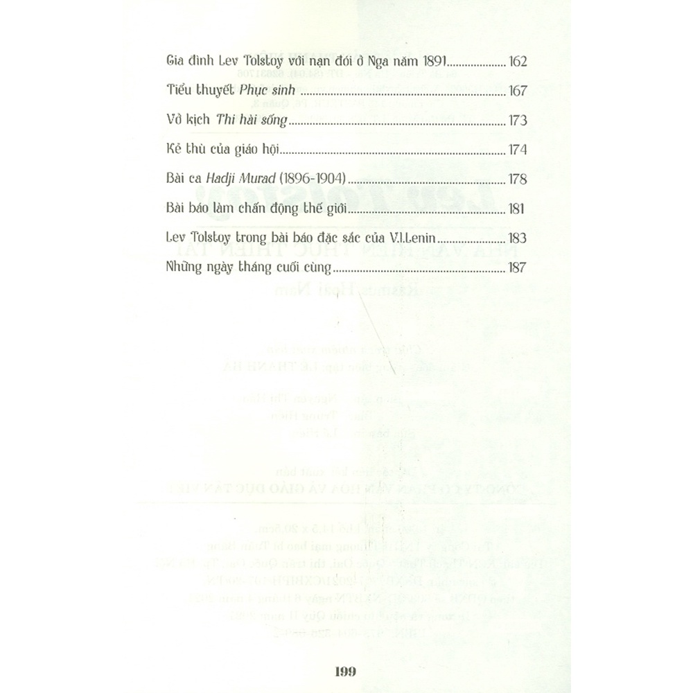Sách - Kể Chuyện Cuộc Đời Các Thiên Tài: Lev Tolstoy - Nhà Văn Hiện Thực Thiên Tài Tác giả Rasmus Hoài Nam Nhà xuất bản NXB Thanh Niên Đơn vị phát hành Công ty Cổ phần Văn hóa và Giáo dục Tân Việt Ngày xuất bản 04-2021 Số trang 200 Kích thước 14.5 x 20.5 cm Loại bìa Bìa mềm Nội dung "Cuốn sách gồm những câu chuyện viết về cuộc đời và sự nghiệp sáng tác của đại văn hào người Nga Lev Nikolayevich Tolstoy, từ những ngày thơ ấu ở Yasnaya Polyana đến những ngày trải qua biến cố của gia đình ở Moscow. Từ khi tình yêu văn học bắt đầu nảy nở cho đến khi ông tạo dựng cho mình một hành trang quý giá trên con đường cầm bút và viết nên những tác phẩm để đời.
