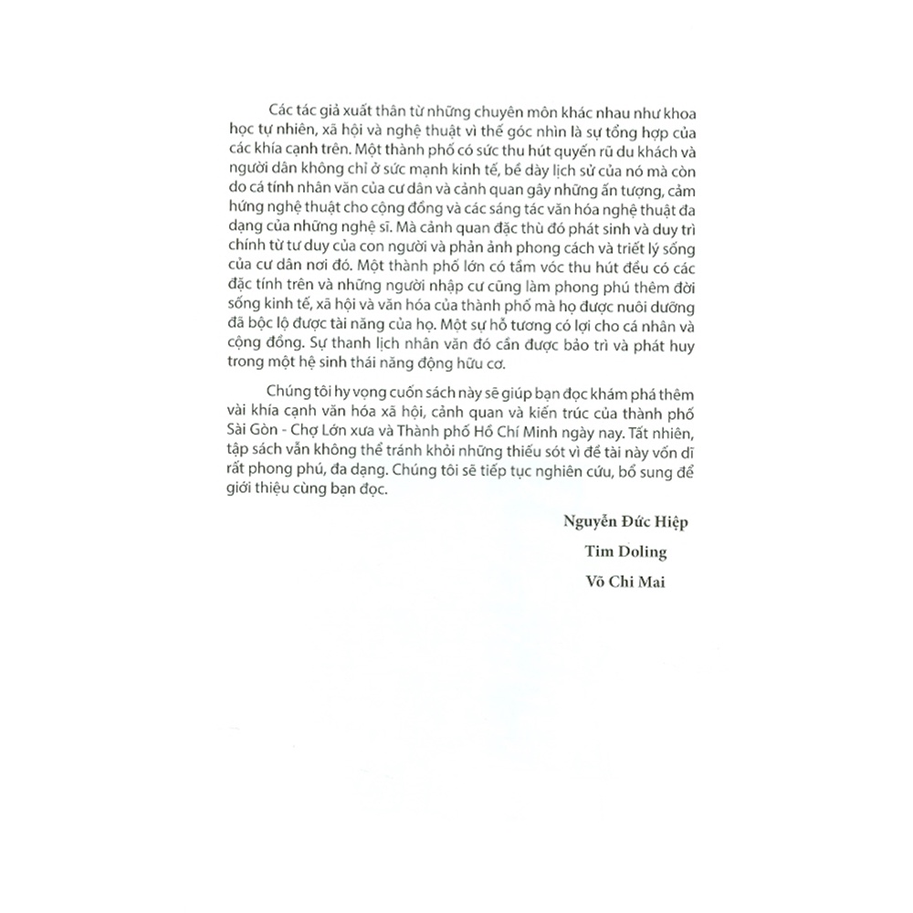 Chúng tôi hy vọng cuốn sách này sẽ giúp bạn đọc khám phá thêm vài khía cạnh văn hóa xã hội, cảnh quan và kiến trúc của thành phốSài Gòn - Chợ Lớn xưa và Thành phố Hồ Chí Minh ngày nay. Tất nhiên, tập sách vẫn không thể tránh khỏi những thiếu sót vì đề tài này vốn dĩ rất phong phú, đa dạng. Chúng tôi sẽ tiếp tục nghiên cứu, bổ sung để giới thiệu cùng bạn đọc."