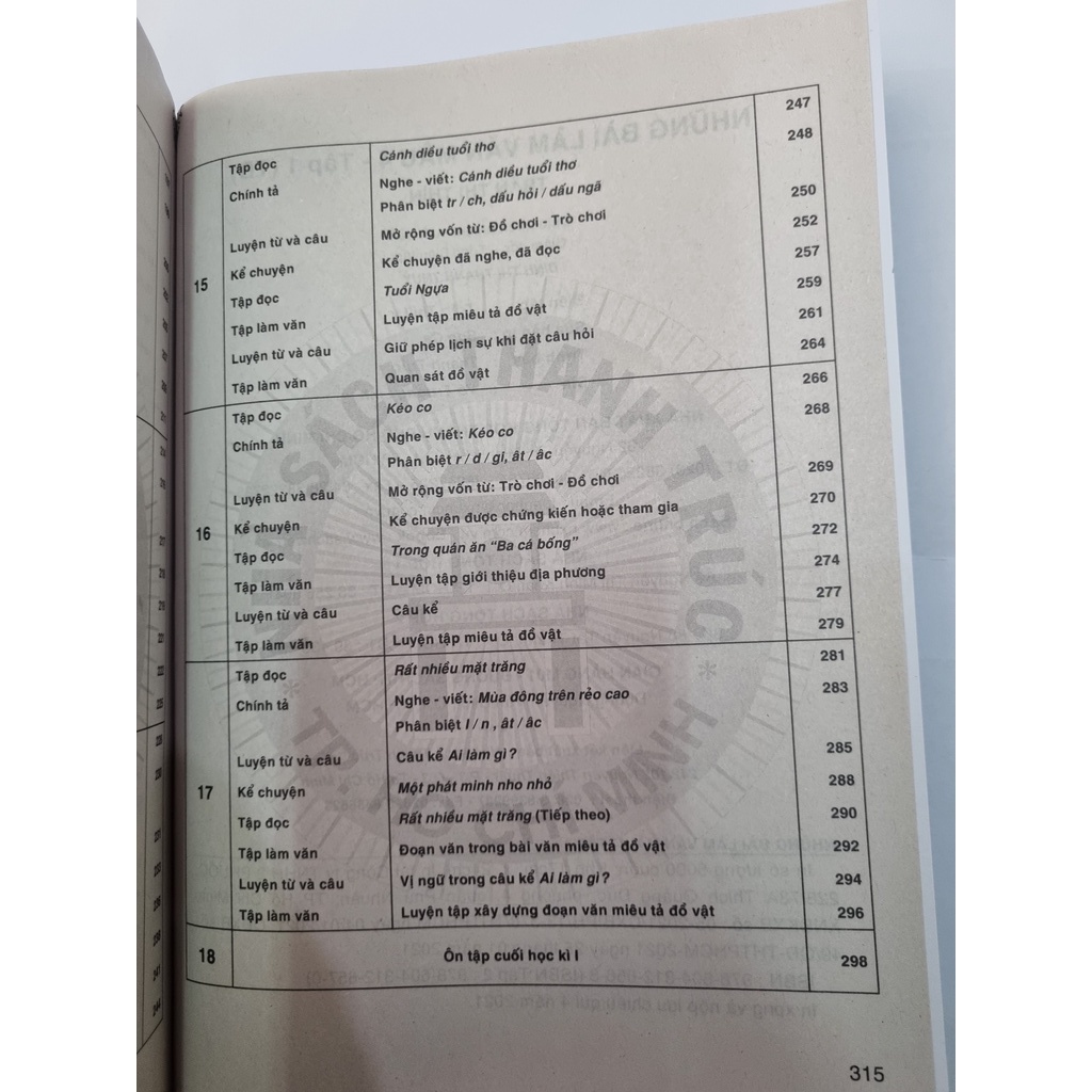 THÔNG TIN: Những bài làm văn mẫu lớp 4 tập 1 Tác giả Trần Thị Thìn Kích thước: 17 x 24 cm Số trang: 319 Phát hành năm 2020 Nhà xuất bản tổng hợp tp hồ chí minh Công ty phát hành: Nhà sách Thanh Trúc Địa chỉ: Nguyễn Thiện Thuật, phường 3, quận 3, tp Hồ Chí Minh Nhà phân phối: Công ty TNHH Sách – Dịch vụ văn hóa Trình Dậu Số 98 Lê Thanh Nghị, phường Bách Khoa, quận Hai Bà Trưng, tp Hà Nội NỘI DUNG: Sách giúp các em học tốt môn văn. Để giúp học sinh nắm vững cách học theo chương trình mới, bộ sách Những Bài Làm Văn Mẫu từ lớp 2 đến lớp 12 (gồm 2 tập, tương ứng với 2 cuốn sách giáo khoa) của tác giả Trần Thị Thìn đã được biên soạn. Cuốn sách hướng dẫn học sinh phương pháp tự học theo trình tự: từ tiếp cận, gợi ý khám phá và lĩnh hội kiến thức đến thực hành - luyện tập để các em từng bước rèn luyện kĩ năng nói, viết và cảm thụ văn học Ảnh thật shop scan, quý khách gạt sang trái để xem ảnh bên trong sách nhé. ****************************** • Nhà sách DuongMaiBook gần 30 năm phát triển tại H.N, chuyên cung cấp dòng sách tham khảo, sách giáo khoa phục vụ học tập, cam kết 100% sách chuẩn NXB. • Chiết khấu cao cho khách sỉ or giáo viên mua số lượng nhiều, vui lòng chat với shop để được hỗ trợ. #sgk #sachgiaokhoa #nhasachonline #duongmaibook #SÁCH_THAM_KHẢO #vănmẫu #nhữngbàilàmvănmẫu