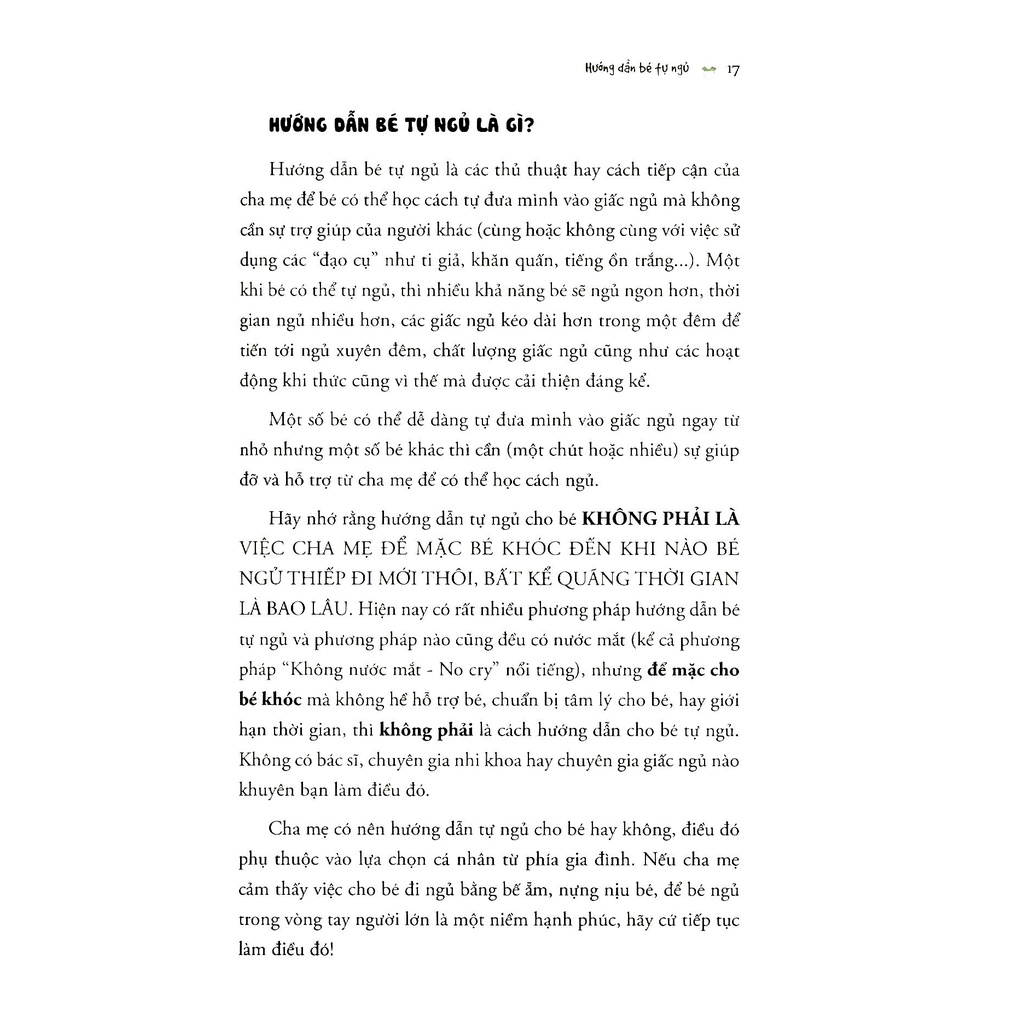 Em bé tự ngủ là một trong những chủ đề nhạy cảm mà bấy lâu nay tuy đƣợc áp dụng rất phổ biến tại phương tây nhưng còn khá xa lạ với các bậc cha mẹ Việt. Em bé tự ngủ hầu như là không thể trong quan niệm của cha mẹ Việt, nhưng một thực tế ngày càng đƣợc hình thành và khẳng định rằng một khi những em bé biết tự ngủ, ngủ tự lập mà không cần sự hỗ trợ (ti mẹ, ru ẵm…) có nhiều cơ hội hơn để ngủ đủ theo nhu cầu của mình. Tác giả: Hachun Lyonnet, Hương Đỗ Số trang: 270 trang Nhà xuất bản :Lao động Nhà cung cấp: Thái Hà Năm xuất bản: 2021