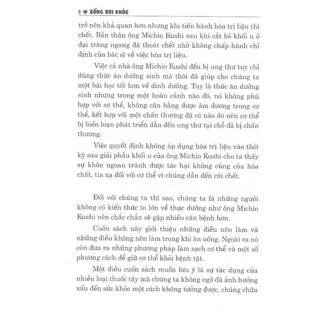 Đối với chúng ta thì sao, chúng ta là những người không có kiến thức to lớn về thực dưỡng như ông Michio Kushi nên chắc chắn sẽ gặp nhiều căn bệnh hơn. Cuốn sách này giới thiệu những điều nên làm và những điều không nên làm trong khi ăn uống. Ngoài ra nó còn đưa ra những phương pháp làm sạch cơ thể và một số phương cách để giữ cơ thể khỏi bệnh tật. Một điều cuốn sách muốn lưu ý là sự tác dụng của nhiều loại thuốc tây mà chúng ta không ngờ đã ảnh h