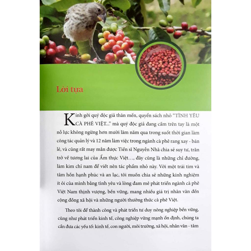 Cuốn sách TÌNH YÊU CÀ PHÊ VIỆT - BÍ QUYẾT TRỞ THÀNH CHUYÊN GIA CÀ PHÊ này đã thể hiện tình yêu cà phê Việt của tác giả sâu đậm như thế nào và không giấu giếm sự lo âu về những nguy cơ không bền vững của cà phê Việt. Đây cũng là “Báo động đỏ” cho tất cả những ai đang theo đuổi làm nghề từ trồng trọt, sản xuất, buôn bán, xuất khẩu cà phê Việt và cả các khách hàng uống cà phê Việt. Những ai đang theo đuổi cà phê Việt giá rẻ, năng suất cao là đang tự mình làm hại cà phê Việt, khiến nó không bền vững, ngược lại với cách làm của các nước hiện nay trên thế giới về cà phê chất lượng cao, giá cao. Tác giả cũng nhấn mạnh đến yếu tố “Xanh, Sạch, Thân thiện với Môi trường” và hy vọng Nhà nước sẽ hoạch định vấn đề này vào chính sách giáo dục, văn hóa với sự tham gia của các phương tiện truyền thông, phổ biến vấn đề bảo vệ môi trường, bảo vệ sức khỏe con người, nhằm cứu nguy cho nông sản Việt nói chung, cà phê Việt nói riêng. Tác giả cũng phổ biến rất nhiều kỹ năng sống kể cả kỹ năng uống, nếm cà phê hay các kỹ năng phát triển cà phê Việt bền vững. Cuốn sách cũng quan tâm đến văn hóa giáo dục, cái tâm của những người làm nghề liên quan đến cà phê Việt từ sản xuất đến thương mại. Nên chăng tất cả các thư viện các trường từ tiểu, trung học đến cao đẳng, đại học nên có để giới trẻ đọc.