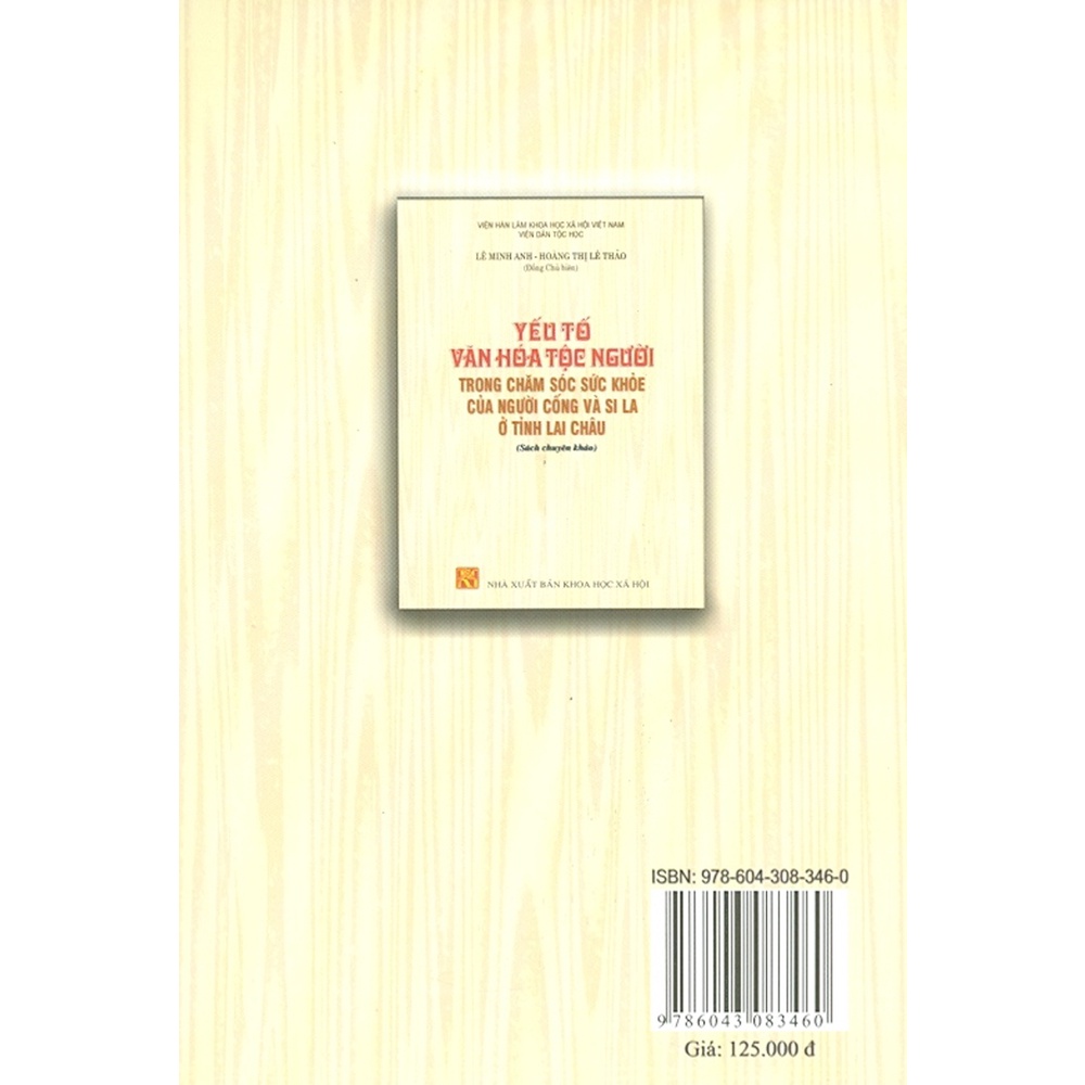 Sách - Yếu Tố Văn Hóa Tộc Người Trong Chăm Sóc Sức Khỏe Của Người Cống Và Si La Ở Tỉnh Lai Châu (Sách Chuyên Khảo) Tác giả Viện Hàn Lâm Khoa Học Xã Hội Việt Nam - Viện Dân Tộc Học: Lê Minh Anh - Hoàng Thị Lê Thảo (Đồng chủ biên) Nhà xuất bản NXB Khoa Học Xã Hội Đơn vị phát hành NXB Khoa Học Xã Hội Ngày xuất bản 06-2021 Số trang 384 Kích thước 14.5 x 20.5 cm Loại bìa Bìa mềm Nội dung "Cuốn sách Yếu tố văn hóa tộc người trong chăm sóc sức khỏe của người Cống và Si La ở tỉnh Lai Châu dựa trên kết quả nghiên cứu của đề tài cấp Bộ ""Ảnh hưởng của một số yếu tố văn hóa tới chăm sóc sức khỏe của hai tộc người Cống và Si La ở tỉnh Lai Châu” do Viện Dân tộc học chủ trì, TS. Lê Minh Anh và ThS. Hoàng Thị Lê Thảo là đồng Chủ nhiệm, được thực hiện từ năm 2017-2018. Cuốn sách được cấu trúc thành 4 chương, với sự tham gia của các tác giả như sau: Lời nói đầu (TS. Lê Minh Anh và ThS. Hoàng Thị Lê Thảo viết). Chương 1: Tổng quan nghiên cứu, cách tiếp cận và khái quát về tộc người Cổng và Si La ở tỉnh Lai Châu (TS. Lê Minh Anh và ThS. Hoàng Thị Lê Thảo viết mục 1.1; PGS.TS. Vương Xuân Tình viết các mục 1.2, 13, 1.4; ThS. Trương Văn Cường viết mục 1.5). Chương 2: Yếu tố văn hóa và chăm sóc sức khỏe của tộc người Cổng và Si La (TS. Lý Hành Sơn viết mục 2.1; ThS. Nguyễn Cảnh Phương viết mục 2.2; TS. Lê Minh Anh viết các mục 2.3, Q.4). Chương 3: Thực trạng chăm sóc sức khỏe hiện nay của tộc người Cổng và Si La (TS. Lê Thị Mùi viết mục 3.1; ThS. Phạm Thị Thu Hà viết mục 3.2, 3.3). Chương 4: Những vấn đề đặt ra trong chăm sóc sức khỏe hiện nay (TS. Lý Hành Sơn viết mục 4.1; PGS.TS. Vương Xuân Tình và TS. Lê Minh Anh viết các mục 4.2, 4.3). Kết luận (TS. Lý Hành Sơn và TS. Lê Minh Anh viết) "