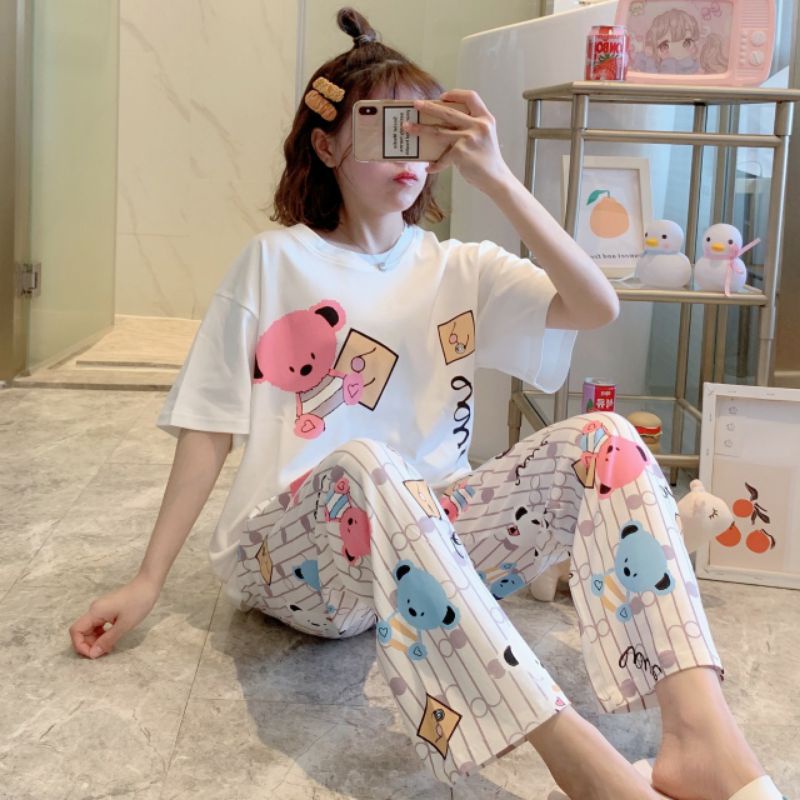 Giới thiệu [ SẴN]Đồ bộ thun quần dài, đồ mặc ở nhà Quảng Châu, họa tiết hoạt hình gấu dễ thương