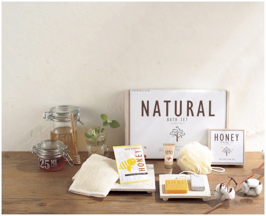 | Quy cách đóng gói | 01 hộp gồm 05 món:Bông tắm,Khăn tắm,Đá chà gót chân,Muối tắm,Kem dưỡng da tay |