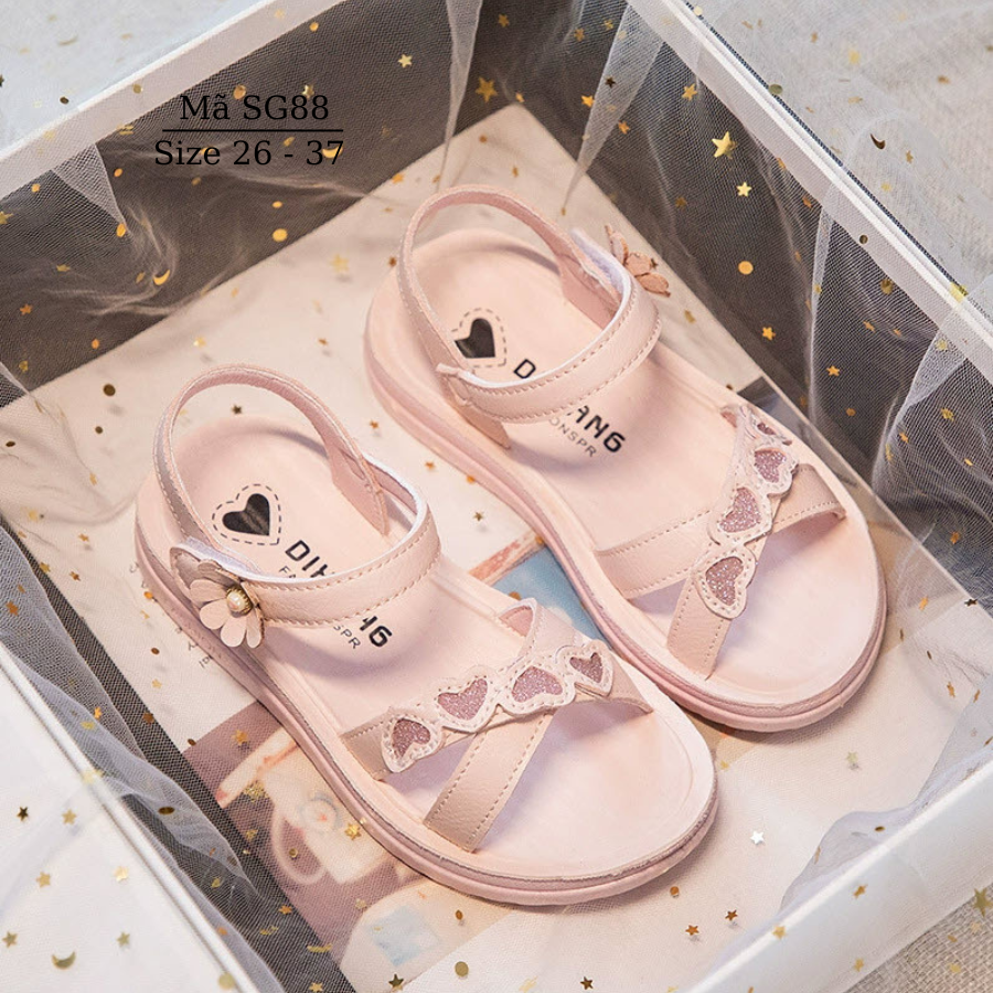 Sandal bé gái SG88 là mẫu dép quai hậu nhẹ nhàng, nữ tính dành cho bé từ 3 đến 12 tuổi, phù hợp để đi học, đi chơi, đi biển hay picnic mùa hè. Được làm từ da PU mềm mại, sandal ôm chân êm ái với quai dán chắc chắn, giúp bé dễ dàng mang vào và tháo ra. Phần quai trước trang trí họa tiết trái tim lấp lánh, kết hợp bông hoa nhỏ bên quai hậu tạo điểm nhấn đáng yêu. Đế cao su siêu nhẹ, chống trơn trượt, giúp bé di chuyển thoải mái, an toàn. Với tone màu hồng phấn ngọt ngào, sandal cho bé gái SG88 dễ phối đồ, là lựa chọn hoàn hảo cho những ngày hè năng động của bé.