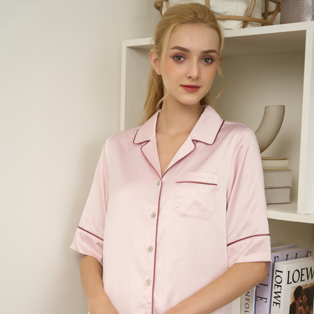 - Bộ satin dài, form thoải mái sang trọng, viền mí nổi bật