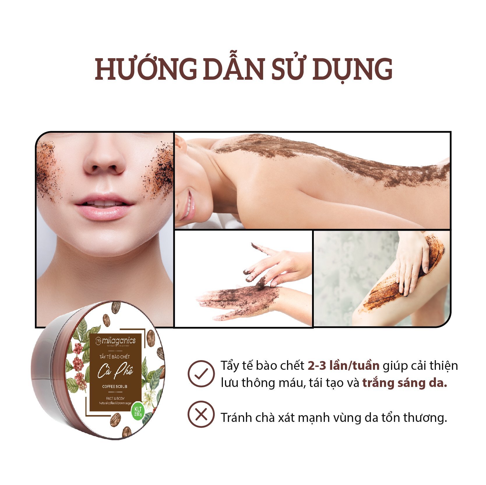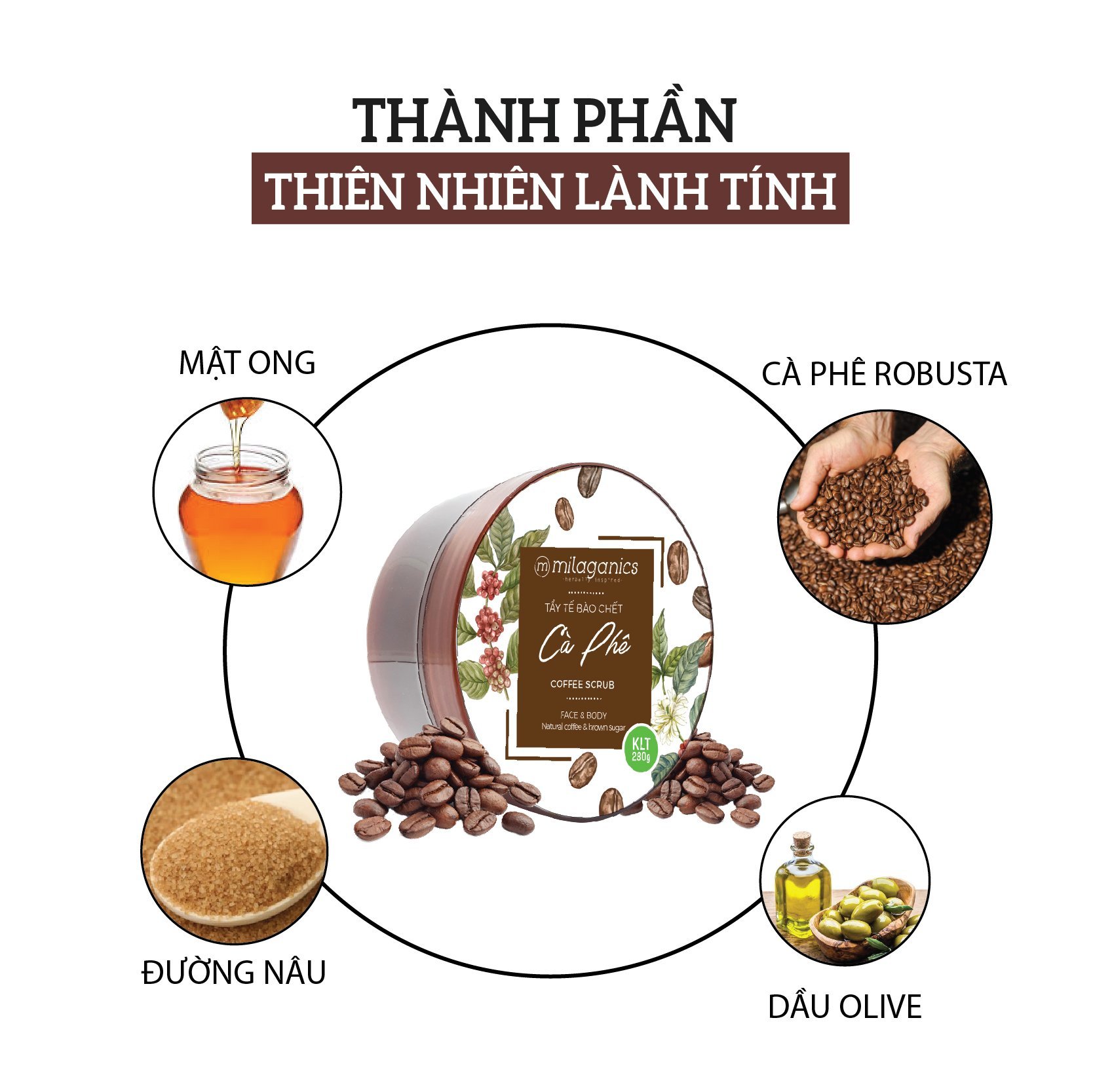 Scrub tẩy tế bào chết cà phê Milaganics tẩy nhẹ nhàng lớp tế bào chết trên da, đồng thời kích thích sản sinh các tế bào mới nhờ bột cà phê hạt mịn Robusta và đường nâu. Sự kết hợp với các thành phần an toàn, có nguồn gốc 100% từ thiên nhiên như dầu Olive, dầu Cám Gạo, Mật Ong, nước Nha đam cùng Vitamin E, Glycerin giúp dưỡng ẩm và làm da trở nên sáng màu, giảm thâm sạm.